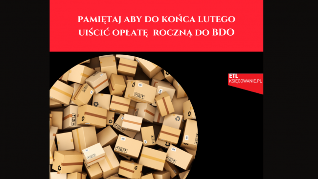 Jest to Baza Danych o produktach i opakowaniach (BDO) – tu należy albo się zarejestrować i wnieść wówczas stosowną opłatę rejestrową, a jak jest się już zarejestrowanym w BDO, uiścić opłatę roczną, właśnie do końca lutego.